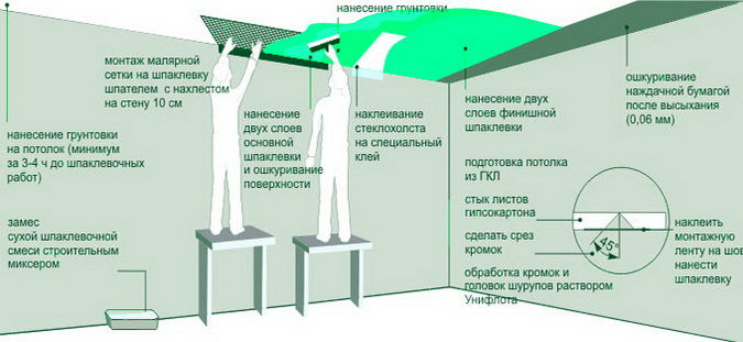 Перед тем как поклеить на потолок флизелиновые или другие обои, необходимо, как и при любом ремонте, очистить поверхность, зашпатлевать и загрунтовать ее.
