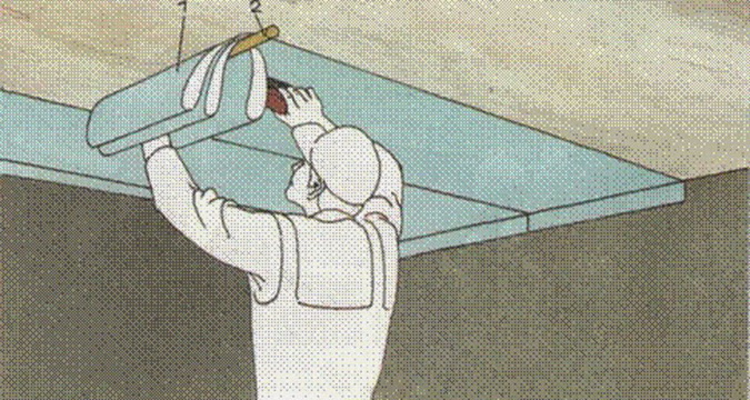 - Когда для отделки потолка используется плитка, то применяется два способа ее монтажа: закрепление плиток с помощью монтажных скоб или полимерного клея и установка пазов плит на рейки.