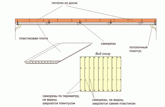 Саморезы Сначала необходимо рассчитать высоту будущего потолка и определить количество материала для обшивки. Затем нужно установить каркас. После этого следует непосредственно установка на потолок пластиковых панелей, а по окончании монтажа – крепление люстры или других светильников.