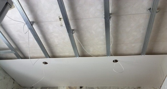 Металлическая обрешетка менее опасна в плане возгорания, но нельзя забывать, что пластик, из которого сделан потолок, при нагревании плавится и выделяет вещества, опасные для жизни. Поэтому даже при использовании металлической обрешетки для панельного пластикового потолка все провода лучше тщательно изолировать, особенно если планируется устройство сложной системы подсветки.