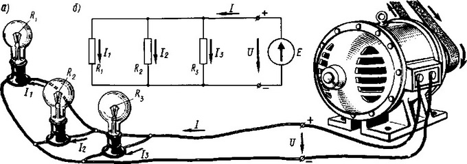Рассмотрим способы соединения электрической цепи. Параллельный тип оказываем минимальное влияние на схему монтажа проводки. При таком способе входящие в цепь элементы не соединены друг с другом, но имеют два общих узла. В этом случае, даже если одна из ламп перегорит и разорвет цепь, остальные не погаснут, поскольку у тока останутся «обходные» пути.