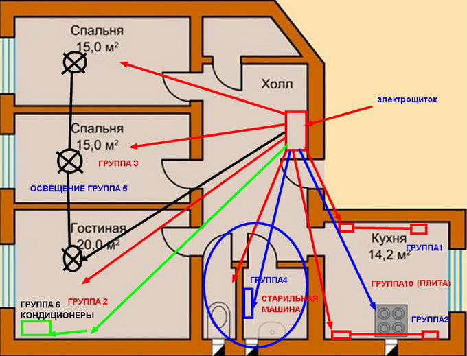 Для кухонной вытяжки, электроплиты, стиральной машины, освещения крыльца, кнопки электрозвонка, автоматических гаражных ворот устраивают отдельные ответвления электропроводки.