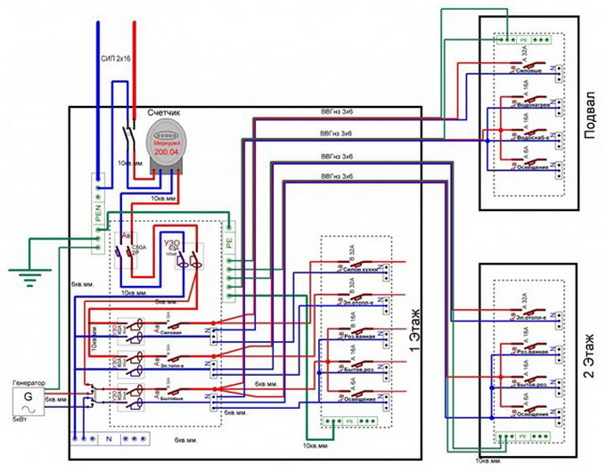 Питающий кабель входит во вводный распределительный щиток здания, где стоят несколько групп автоматов и устройств защиты.