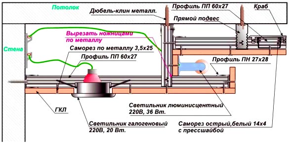 Данную часть каркаса нужно прочно прикрепить к потолку, фиксируя одновременно на стенах направляющие профили по нанесенной предварительно разметке.