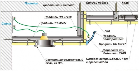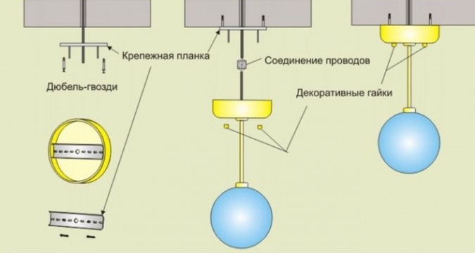 Под осветительные приборы необходимо вырезать соответствующие отверстия в гипсокартоне. Делать это лучше, пока плита находится на полу. Под тяжелые люстры требуются отдельные крепежные детали.
