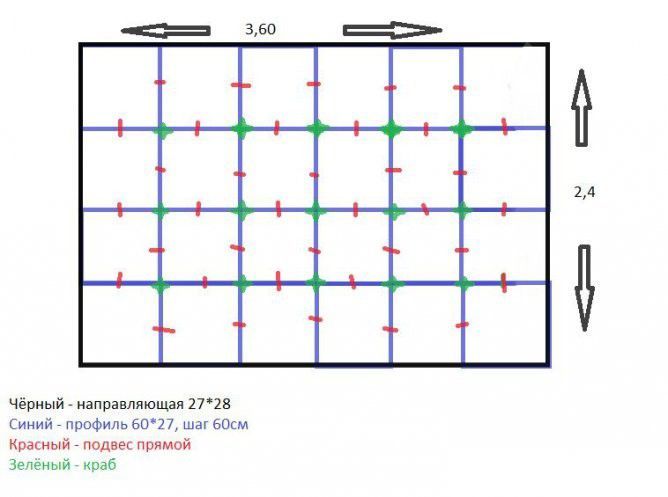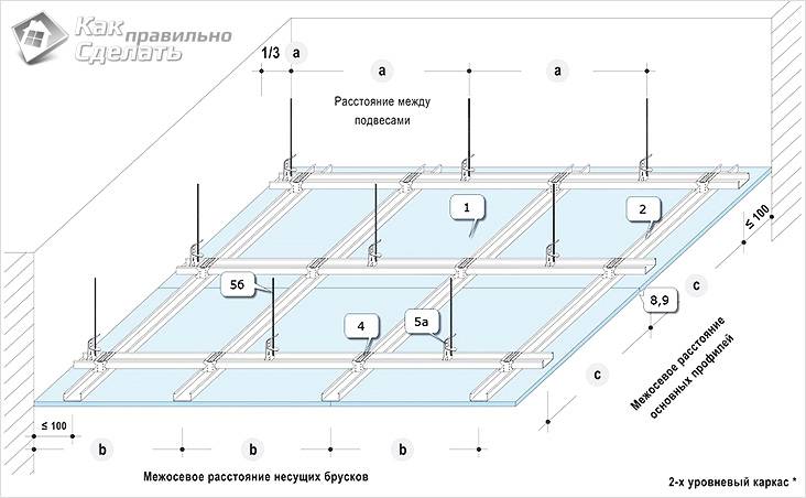 Стоечные профили нужно прикрепить к потолку с шагом в 60 см. Затем между ними следует вставить поперечные перемычки (также на расстоянии 60 см одна от другой).