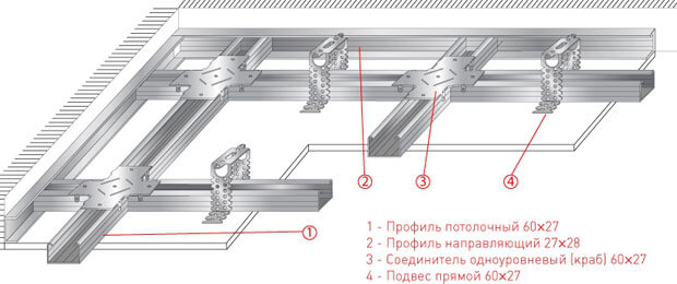 Несущие профили нужно крепить к потолку с помощью прямых подвесов, которые предварительно устанавливаются с шагом в 40 см. При монтаже каркаса могут пригодиться и крабы. Далее профили соединяются друг с другом, а также с подвесами с помощью саморезов.