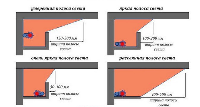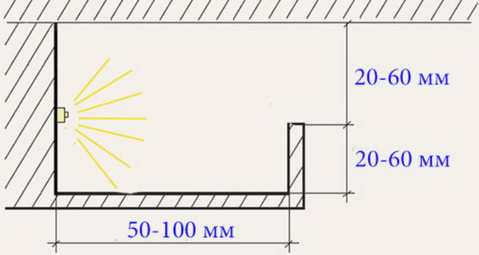 При монтаже гипсокартонного потолка с подсветкой диодные ленты устанавливаются достаточно просто. Эта работы выполняется путем наклеивания к потолку в специальных нишах — небольших укрытиях. Благодаря своей долговечности их можно использовать в натяжных потолочных системах.