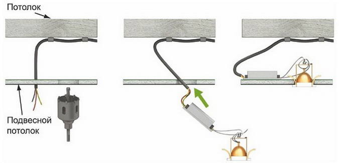 Укладка проводки производится на этапе монтажа каркаса потолка и учитывает расположение всех осветительных точек.