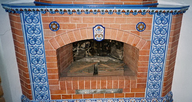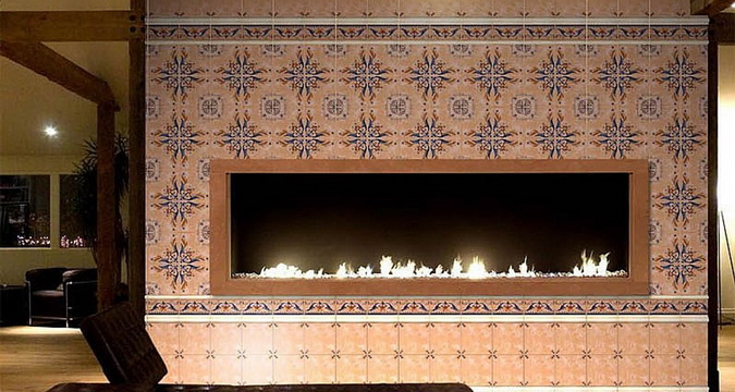 Также для отделки камина подойдет майолика — декоративная плитка из обожженной глины, сверху покрытая расписным слоем (глазурью). Это более дорогой материал, но и выглядит он значительно красивее. Работать с майоликой достаточно сложно: для укладки нужен предварительно составленный эскиз, и будет лучше, если укладку выполнит профессионал.