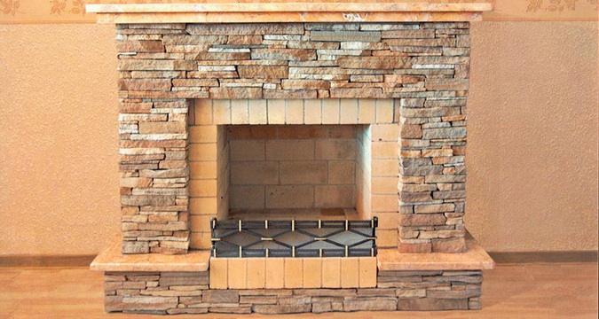 Технология облицовки камина камнем подобна монтажу плитки, но природный камень монтируют на предварительно установленную металлическую сетку, чтобы он не отвалился. Также между камнями не обязательно делать зазоры с одинаковым расстоянием, что упрощает укладку.