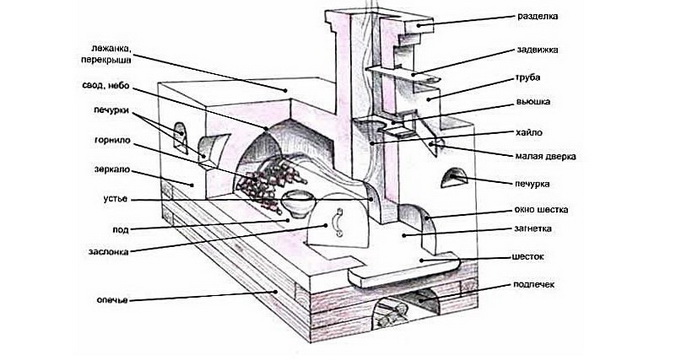 Современные печи могут отличаться от традиционных внешне, но по конструкции классические русские печи остаются прежними и состоят из следующих элементов.