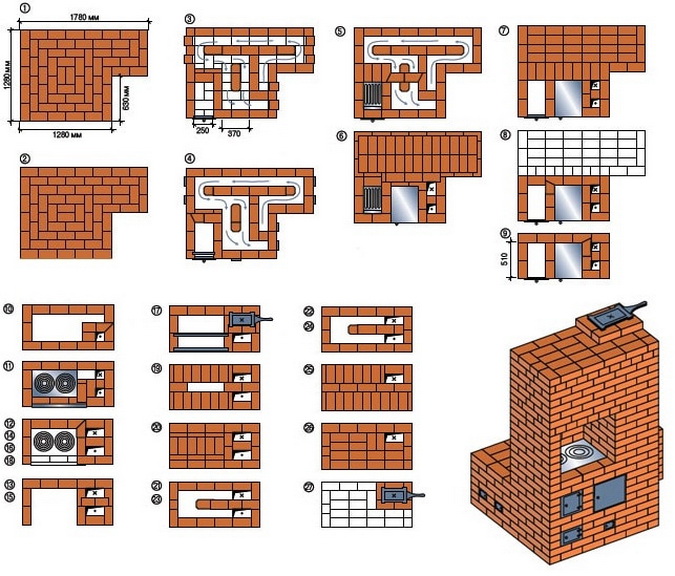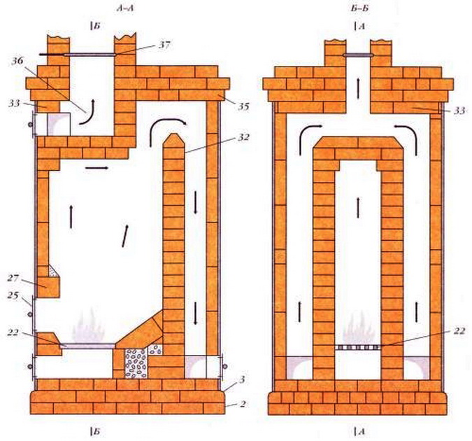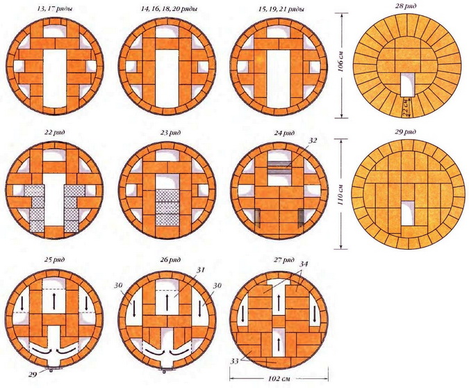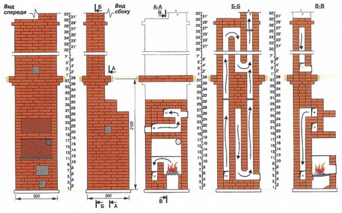 - Из огнеупорного кирпича выкладывают только топку, для остального можно использовать даже пустотелый кирпич; на теплоотдачу это не влияет
