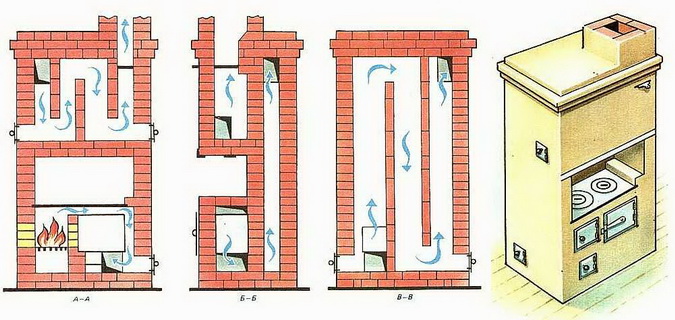 Голландка с плитой. Эта печь более сложной конструкции. Ее недостатком является отсутствие конфорок на варочной поверхности. Она пригодна только для разогрева пищи, консервирования, но варить на ней нет возможности. В голландке с плитой топливо тлеет долго, поэтому на ней можно стерилизовать банки с заготовками.