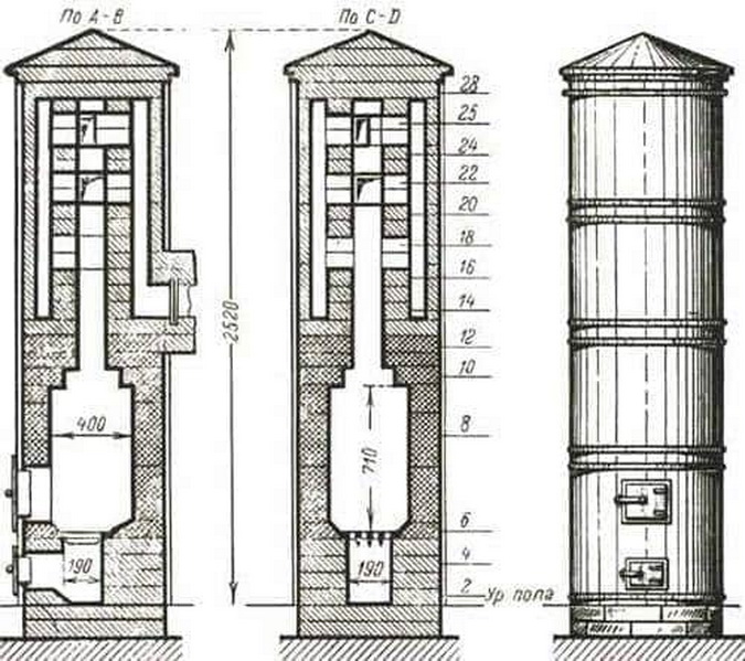 Круглые голландки. Это могут быть небольшие печи с металлическим кожухом или крупные обычные кирпичные печи с кирпичным футляром, который выкладывают из облицовочного кирпича с помощью цементнопесчаного раствора.