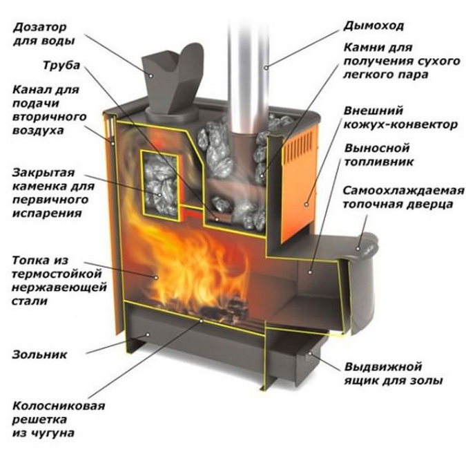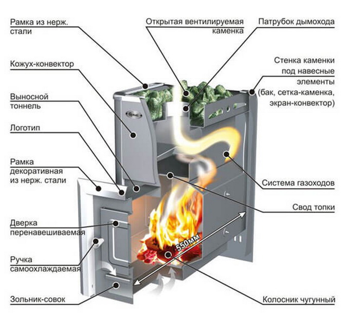 - Наличие дымохода — системы выведения продуктов горения, в том числе угарного газа. Труба располагается под печью, что способствует дополнительному нагреву камней.