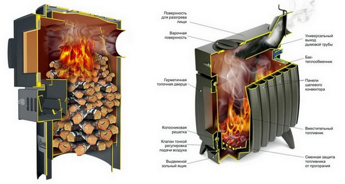 Принцип работы печи-буржуйки очень прост. Древесину закладывают в топку и поджигают. В процессе горения выделяется много тепла, которое нагревает корпус печи. Раскаленный металл отдает тепло в помещение. За счет большой длины дымовой трубы количество тепла увеличивается.