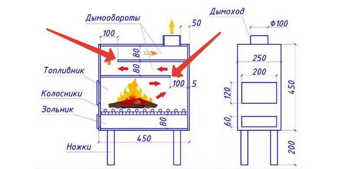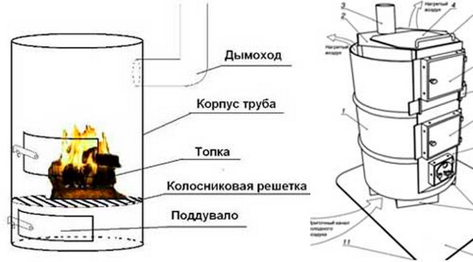 Внешне буржуйка представляет собой бочку (или прямоугольный ящик) на устойчивых ножках. Конструкция имеет дверцу, отсек для закладки дров и зольник. У нее глухой под и высокая дымовая труба.