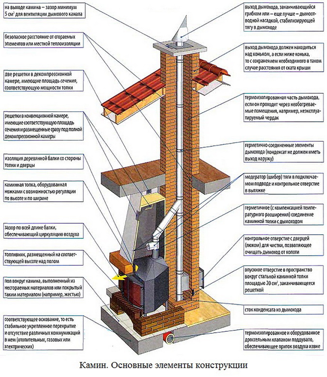 - Дымоход — устройство для обеспечения тяги и выведения продуктов горения наружу.