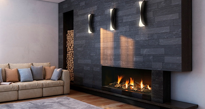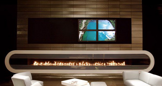 Модерн. Этот стиль совмещает в себе базовые классические элементы и современные тенденции дизайна.Благодаря этому камины великолепно вписываются в интерьер городской квартиры или офиса. Они имеют прямоугольную или полукруглую форму, вытянутую по вертикали, и обычно занимают все пространство стены от пола до потолка.