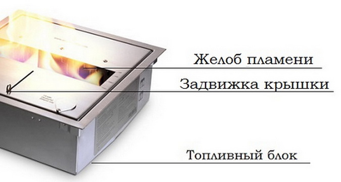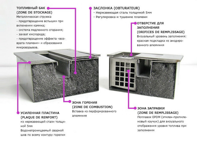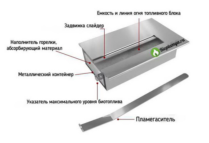 - Топливный блок — резервуар для биоэтанола, внутри которого помещен пористый наполнитель или металлическая стружка, не выделяющие вредных веществ.