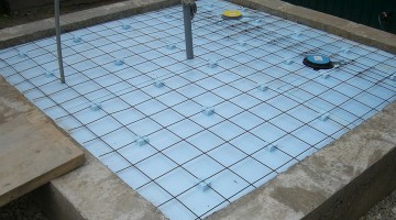 - На дно укладывают армирующую сетку — желательно из специального пластика. Если используется металл, придется заливать более толстый слой бетона. Чтобы предотвратить коррозийное повреждение металла, которое повлечет за собой разрушение бетона, толщина бетонного слоя над сеткой должна быть не менее 3 см. Дно можно заливать и до, и после, и во время заливки стен, но обычно его заливают первым, а через два дня делают стены либо его заливают через два дня после заливки стен — в это время два слоя «молодого» бетона, только набирающего прочность, еще могут прочно схватиться друг с другом.