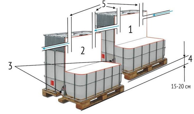 Эта очистительная система изготавливается аналогично системе из еврокубов, но из меньших по объему емкостей: пластиковых или металлических бочек. Это наиболее простой и доступный вариант, практически не требующий затрат.