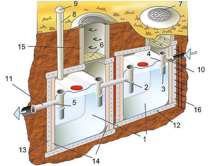 Комбинированные септики — в них камера-отстойник, метантенк и осветлитель выполнены из разных материалов. Например, из пластика и кирпичного бункера или из стеклопластика и бетонных колец.