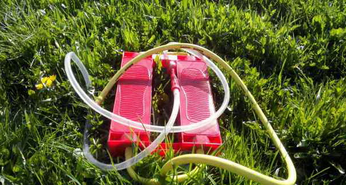 Переносной душ «топтун» представляет собой резиновый коврик с двумя встроенными насосами. Вода подается путем поочередного нажатия педалей ногой. Под давлением жидкость поступает на душевую лейку. Чем быстрее человек топчет педали, тем сильнее напор.