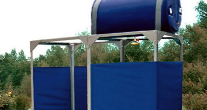 Садовый душ-стойка представляет собой стойку на треноге с душевой лейкой на конце, которую подключают к насосу или бойлеру.