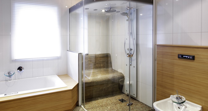 Душ в доме. Душ внутри дома должен располагаться у наружной стены с солнечной стороны — там будет теплее в холодный сезон. К тому же в таком случае легче устроить окно для освещения и вентиляции, подвести воду и организовать слив. Хотя стоит отметить, что современные достижения сантехники позволяют устроить душевую даже в спальне.