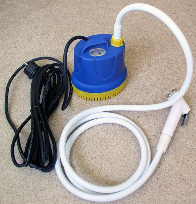 Мобильный душ-насос с подогревом – это электрический прибор, работающий от сети. Его опускают в бак, бочку или другую емкость с холодной водой. Для подачи жидкости на ручке лейки нужно нажать рычаг. Такой насос можно подключить к прикуривателю автомобиля.
