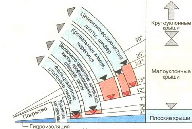 Ниже приведены значения минимального уклона кровли в зависимости от кровельного материала: