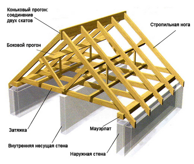 Насланные стропила используют для односкатных крыш. Их укладывают вдоль ската. Опираются они на наружные стены строения. Затяжка для наклонных стропил не требуется.