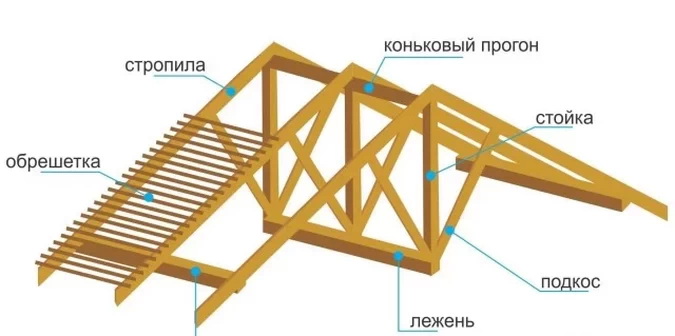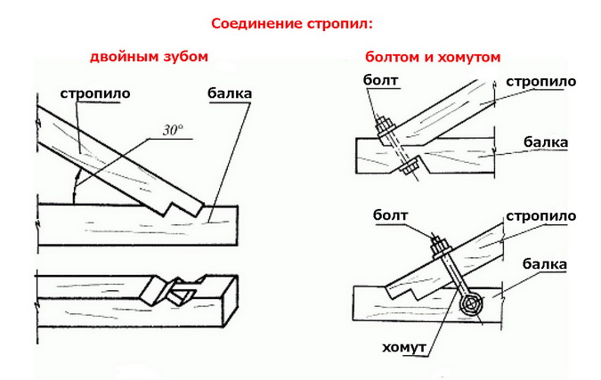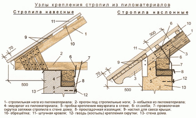 Коньковый прогон делают из брусьев 10 х 10 мм. Лежень (нижний горизонтальный брус на стойке, служащий опорой подкосам) и мауэрлат (опорный брус для стропил) выполняют из брусьев 10 х 10 мм или бревен, стесанных на два канта. Стропильные «ноги» крепят к мауэрлату и коньковому прогону с помощью хомутов или скруток. Их прибивают большими гвоздями к мауэрлату и прогону в верхнем (коньковом) узле. Хомуты изготавливают из стальной полосы, скрутки — из проволоки диаметром 6 мм.