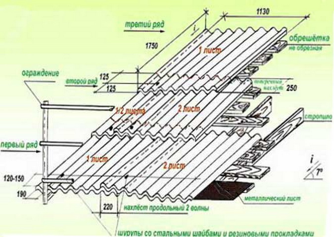 Один лист шифера поперечного ряда должен перекрывать другой на одну волну. В местностях, где дуют ветра выше 8 баллов, шифер крепят шурупами и скобами в карнизном ряду.