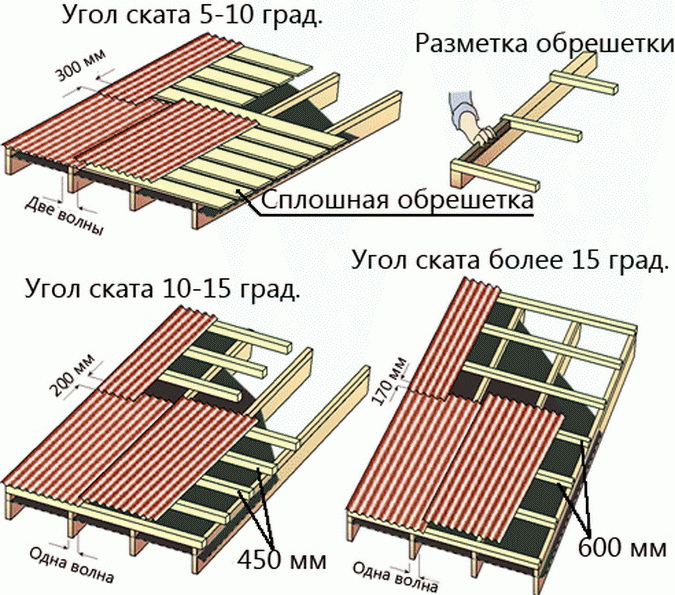 - Под волнистые асбоцементные листы, алюминиевые гофры, черепицу и деревянные покрытия делают разреженные основания.
