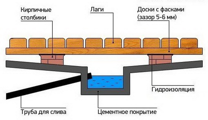 Доски для протекающего пола закрепляют на лагах с использованием гидроизоляции. Между досками оставляют зазор в 5-6 мм, чтобы вода могла свободно утекать, несмотря на набухание древесины.