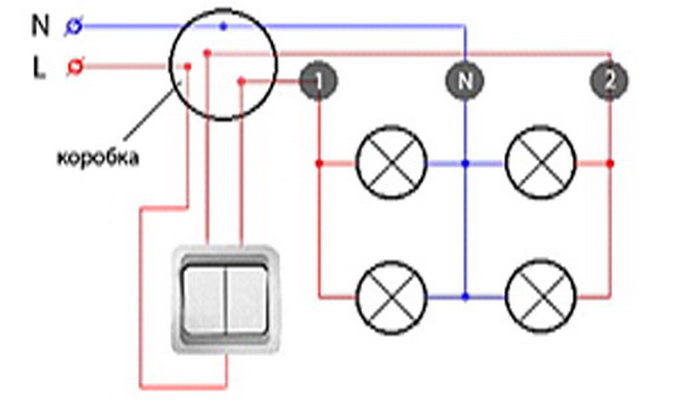 Рассмотрим монтаж проводов в светильнике с пятью лампочками, для которого требуется установить двухклавишный выключатель так, чтобы при нажатии одной клавиши загорались три лампочки, а при нажатии второй — две.
