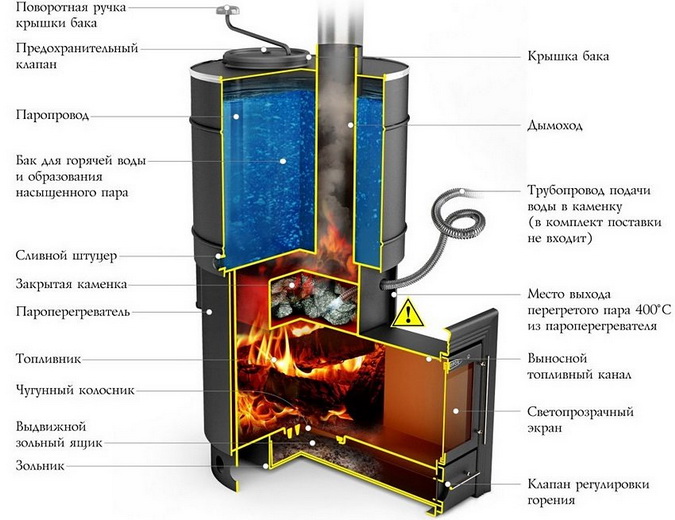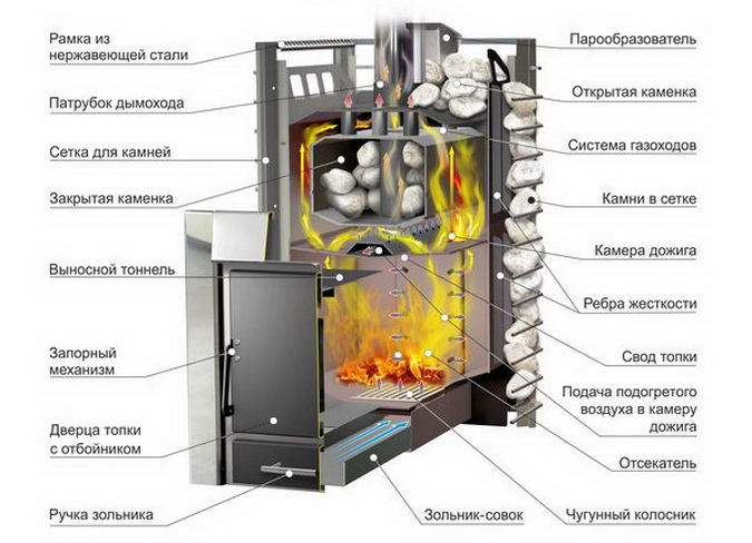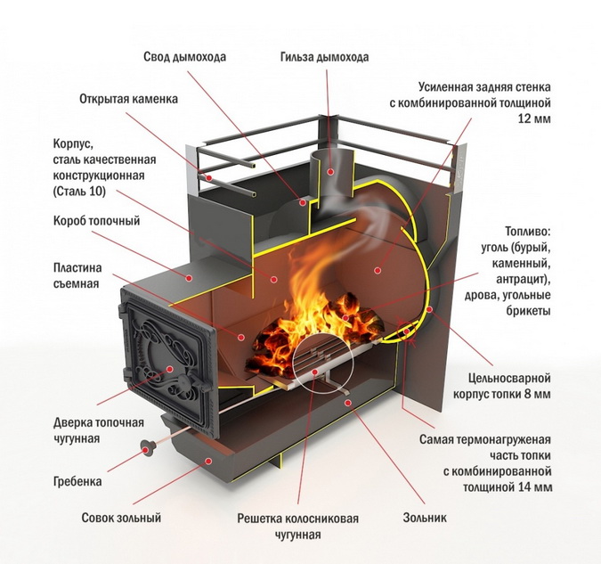 Даже в простейшей печи с тягой для бани должны быть четыре элемента:
