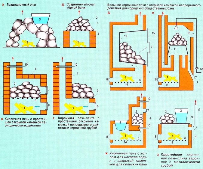 Чаще всего печи постоянного действия металлические, а периодического — кирпичные, но есть и исключения. Если же в кирпичной печи делается глухая каменка, такую печь называют комбинированной.