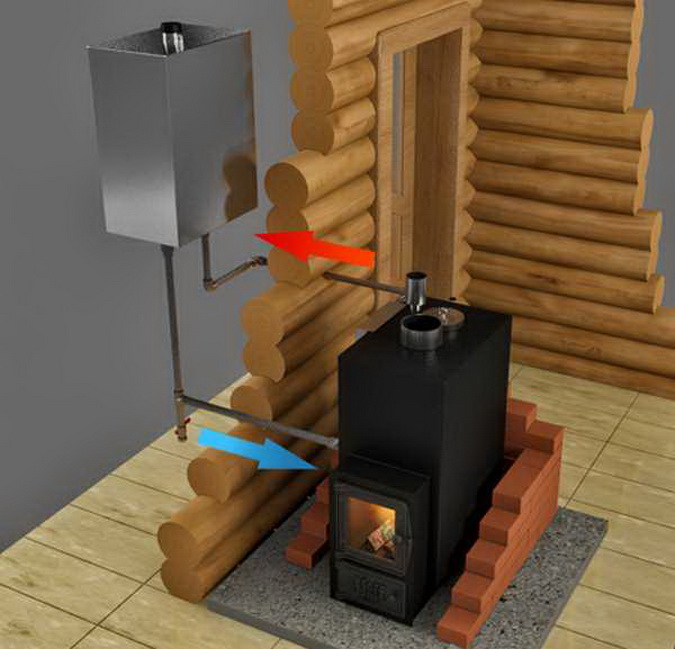 Воду нагревают в котле или змеевике. Котел вмазывают в отопительную печь, а змеевик устанавливают в топливнике. Воду нежелательно доводить до кипения: от этого в бане резко повышается влажность.