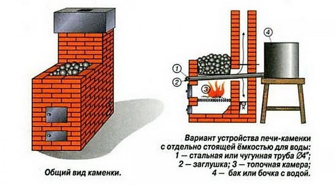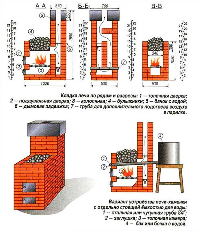 На этой странице подробно описано, как возводить банную печку, оборудованную чугунной мойкой; комбинированную каменку с баком, размещённым наверху; и металлическую печь из трубы.