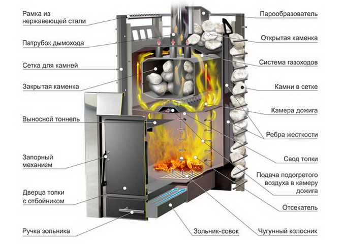Камни в такой печи не контактируют с огнем напрямую, поэтому в ней можно использовать любой вид твердого топлива.