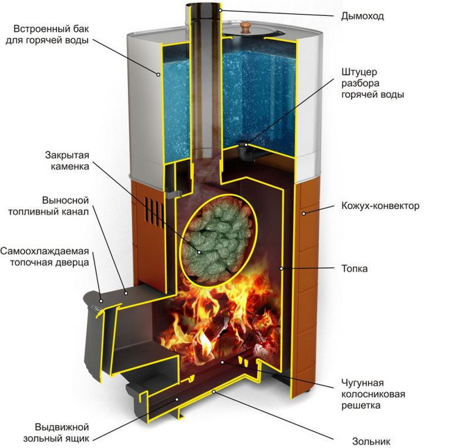 Плюсы печи-каменки комбинированного действия с верхним размещением бака для воды: