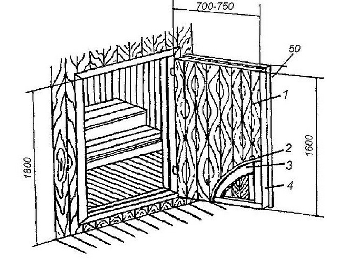 Шпонки, т. е. бруски, которые прибивают перпендикулярно дверным доскам, делают трапециевидными. Бруски для шпонок должны быть той же толщины, что и дверные доски. Длина шпонок должна быть на 100-150 мм больше, чем ширина дверных досок.