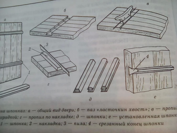 Дверь на шпонках собирают из строганных досок толщиной 40—50 мм. По кромкам досок выбирают четверти, или шпунты.