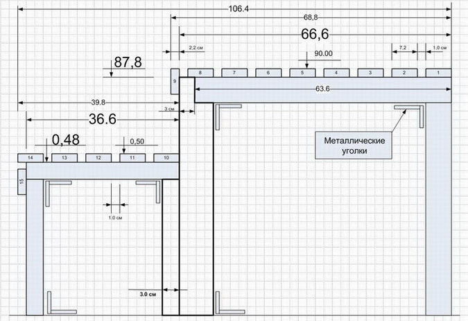 Каркас начинают собирать с верхнего яруса, примыкающего к стене. Сначала отрезают необходимое количество опорных стоек и поперечных перемычек, длина которых равна глубине полка.