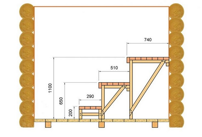 Прежде чем закупать материал для полок в бане, сделайте чертеж или набросок будущей конструкции. На нем не обязательно прорисовывать все узлы, так как изготовить полки очень просто. Но желательно проставить размеры, чтобы рассчитать количество досок, брусков и крепежа.