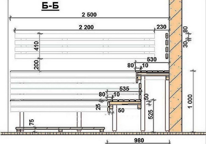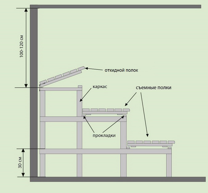 - По возможности лучше делать полки в два или три яруса, располагая их ступеньками, что позволит каждому человеку выбирать комфортную для себя температуру (чем выше ярус, тем выше температура воздуха).